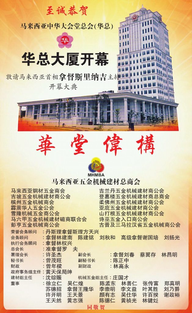 Honorary Advisor of MHMBA cum President of the Federation of Chinese Associations Malaysia (Hua Zong) Tan Sri Pheng Yin Huah said it seemed to be ‘Mission Impossible’ at the outset when he first started to raise RM85 million to build Wisma Hua Zong. Fortunately with much voluntary financial support from the Malaysian Chinese community the building is completed successfully. Prime Minister Dato’ Sri Haji Mohammad Najib bin Tun Haji Abdul Razak officiated the opening ceremony of Wisma Hua Zong on Saturday 16 January 2016.