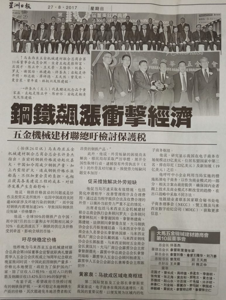 (27/08/2017) 钢铁飙涨冲击经济 五金机械建材联总吁检讨保护税